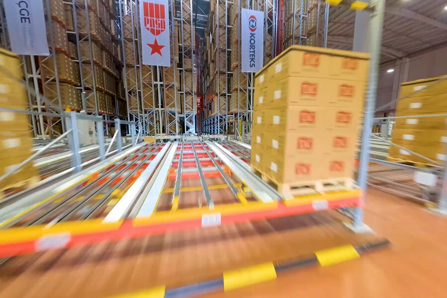 In cooperation with the Turkish company UCGE, we equipped a high bay warehouse for finished products from Korteks in Bursa (Turkey). There are four aisles with cranes and two transport shuttles on the same rail and complex conveyor system with output through a gravity rack.