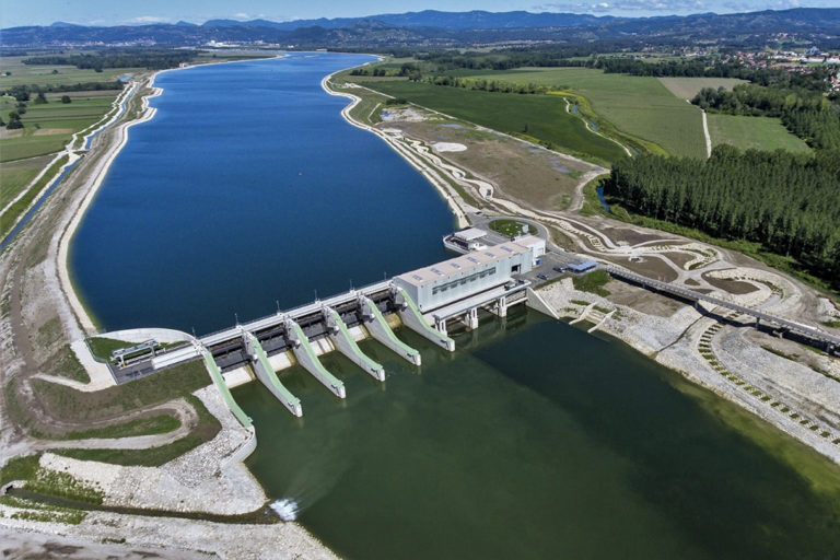 HPP Brežice is the fifth hydroelectric power plant in the chain of six HPPs on the lower Sava with a nominal capacity of 47.4 MW. It is of the flow-accumulation type with three vertical aggregates installed with a nominal flow of 500 m3/s, five flow fields and an average annual production of 161 GWh.